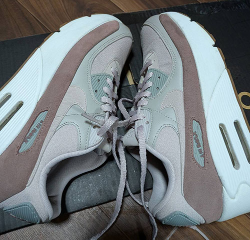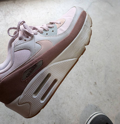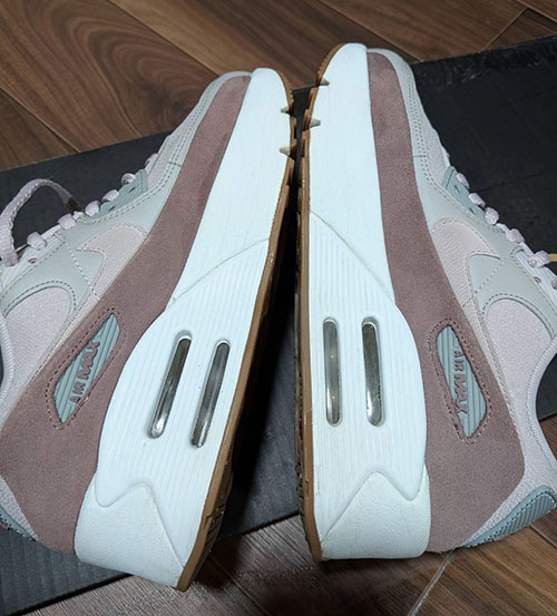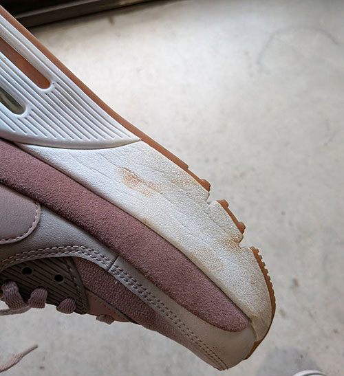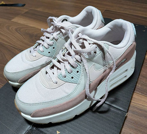 こうして並べてみると、サイト画像では光で飛んでしまっていた白いメッシュ部分の黄ばみや、スエード部分の毛羽立ち、ソールの細かい傷が、実物でははっきりと確認できます。
